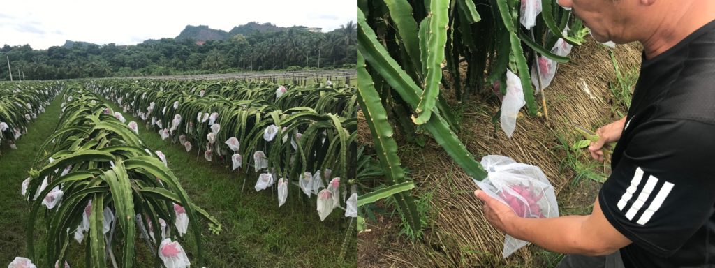 変った見た目と名前から果実に覚えのある方は多いと思いますが、園地の様子はあまり知られていないのではないでしょうか。ドラゴンフルーツはサボテンの1種で、現地ではピタヤと呼ばれています。日本へ輸入する際、販促のために中国語の火竜果を直訳したドラゴンフルーツと名付けられました。自由に成長させると10mにもなる巨大サボテンなので、傘のように垂れ下げて生育することで収穫しやすくしています。自然状態では写真の数倍の実がつきますが、こちらの園地は摘果して栄養を集中させています。日本には輸送が難しく未熟な状態でしか輸入できませんが、現地で頂く完熟ドラゴンフルーツは甘くて美味しいです。