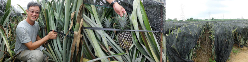 「ミルクパイン」は、台湾パインの中でも育てるのが一番難しいと言われており、産地も限られています。果実が大きいため、果重で倒れないように柵を設置し、ゴムで縛って栽培しています。また、熟度が回るのが早いため、収穫熟度の見極めが重要です。