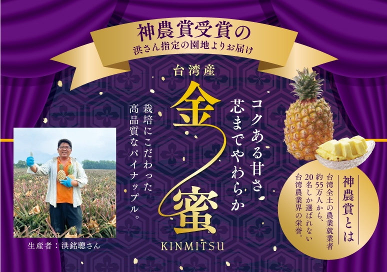 神農賞とは2年に一度選考が行われる台湾の農業賞。日本でいう日本農業賞にあたり、農業経営に意欲的に取り組み、優れた功績を挙げた20の農家が選出されます。青果物だけでなく、農業、水産、畜産が対象。2023年度の受賞者でパイン農家は洪さんのみ。まさに政府が認めた最優秀農家です!