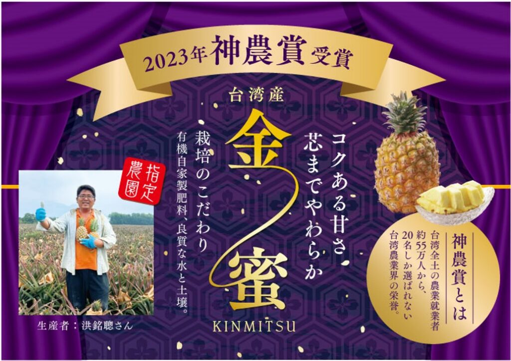 神農賞とは2年に一度選考が行われる台湾の農業賞。日本でいう日本農業賞にあたり、農業経営に意欲的に取り組み、優れた功績を挙げた20の農家が選出されます。青果物だけでなく、農業、水産、畜産が対象。2023年度の受賞者でパイン農家は洪さんのみ。まさに政府が認めた最優秀農家です!