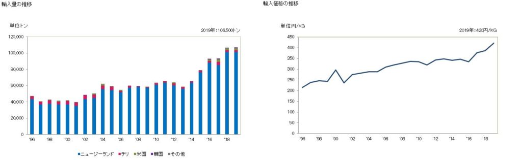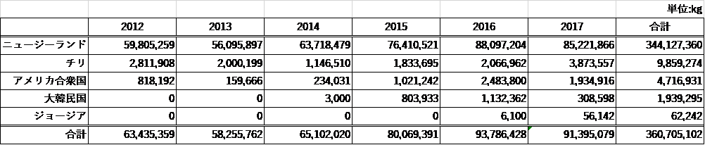 ニュージーランド産が圧倒的なシェアを持っており、次いでアメリカ、チリ産が続きます。