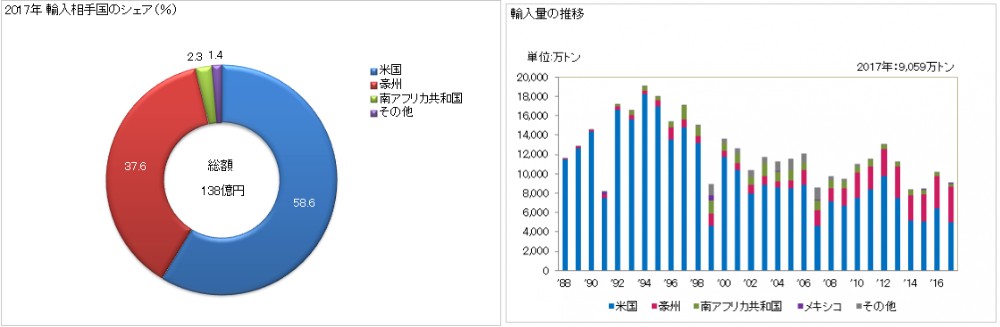 オレンジの輸入先は長らくアメリカの独占状態でした。これは、果実の大害虫であるミバエ侵入防止の観点から、ミバエ発生国からの輸入には長期間の低温処理が必要など厳しい規制があったためです。1991年のオレンジ輸入自由化以降にこれらの規制が徐々に緩和されると、南アフリカ、チリ、オーストラリアなどの産地からの輸入が増加しました。中でもオーストラリア産のオレンジは国の政策で積極的に輸出拡大を行っており、ここ数年で大きく輸入量を増やしました。1991年と1999年に輸入量が大きく減少しているのは、アメリカの産地で寒波による被害が発生したためです。