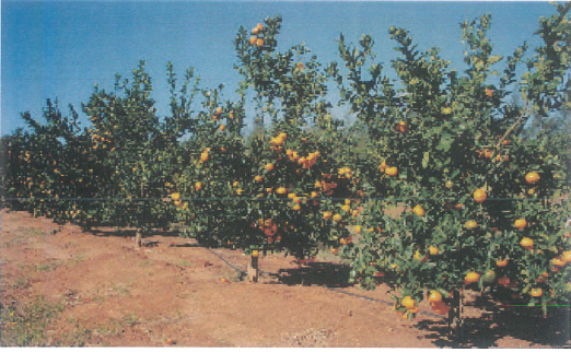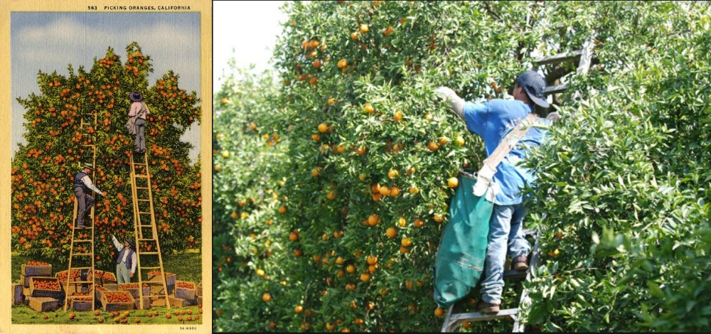 現在でも果実の収穫は機械化が難しく、大半は手作業で収穫されています。オレンジも輸送手段こそ機械化されましたが、収穫方法は昔からあまり変わっていません。写真では梯子を使って収穫していますが、下の写真のように手に届く範囲で収穫できるよう木を低く切りそろえている園地も多いです。