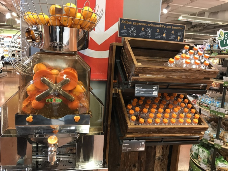 こちらはセルフサービスのオレンジ絞り器です。最近、国内のスーパーでも導入している店舗がありますが、まだまだ珍しいこの機械は、オレンジジュースが日常的に飲まれる国のスーパーではよく見かけます。また、スペインでは多くの家庭にこのような皮を剥かずに投入できるオレンジ絞り器が置いてあるそうです。