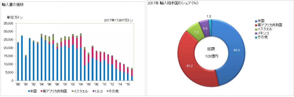 1971年にグレープフルーツの輸入が自由化されると輸入量は大幅に増え、価格も手軽に購入できるようになりました。高級な贈答品としての立場は失ってしまいましたが、日常的に消費される果物になったと言えます。その後、輸入規制緩和に従って南アフリカ産がシェアを伸ばし、現在では旬の時期が異なるアメリカ産と南アフリカ産が半分ずつのシェアを持って通年供給されています。