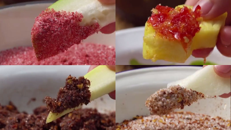 タイの調味料、プリック・グルアに様々な果物をつける様子