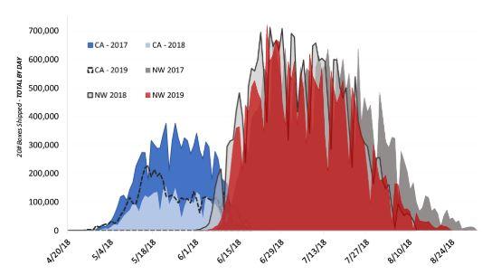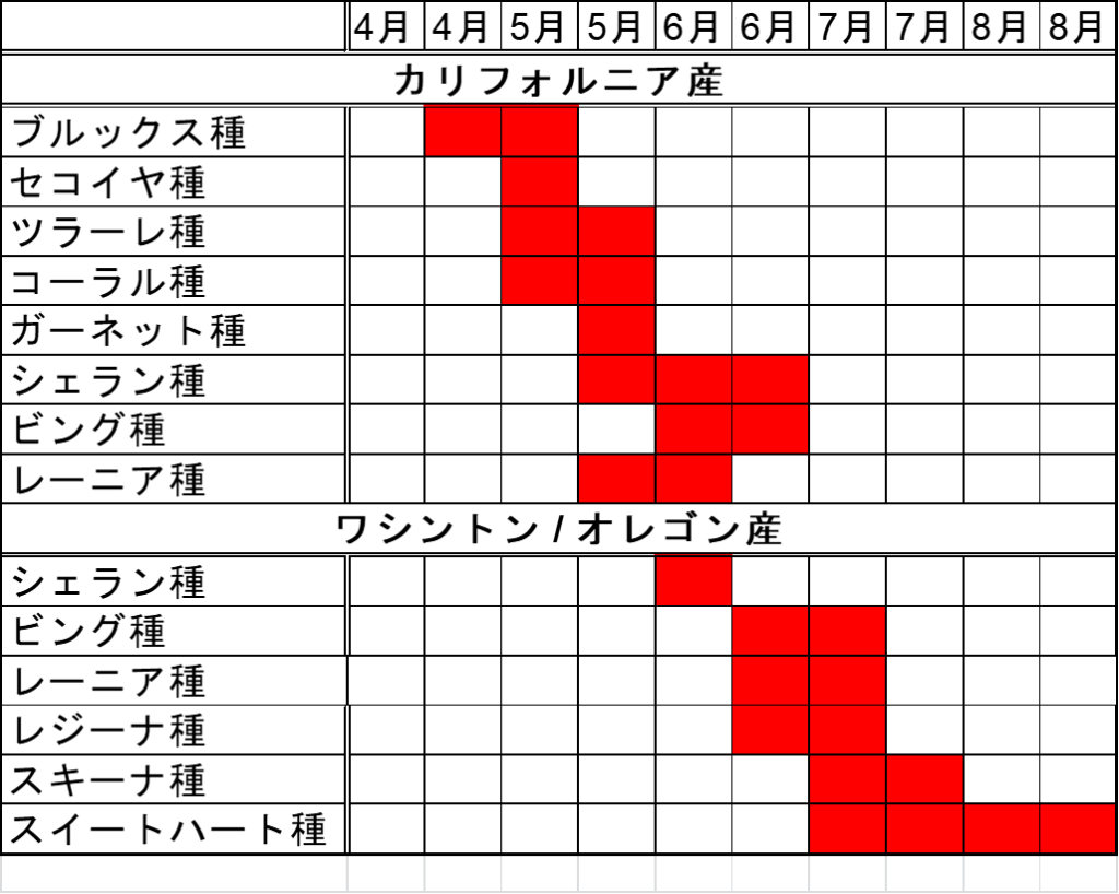 5月頃、暖かいカリフォルニア州から収穫が始まり、オレゴン州、ワシントン州と北上するように産地が移っていきます。7月中にはほとんど収穫は終わります。