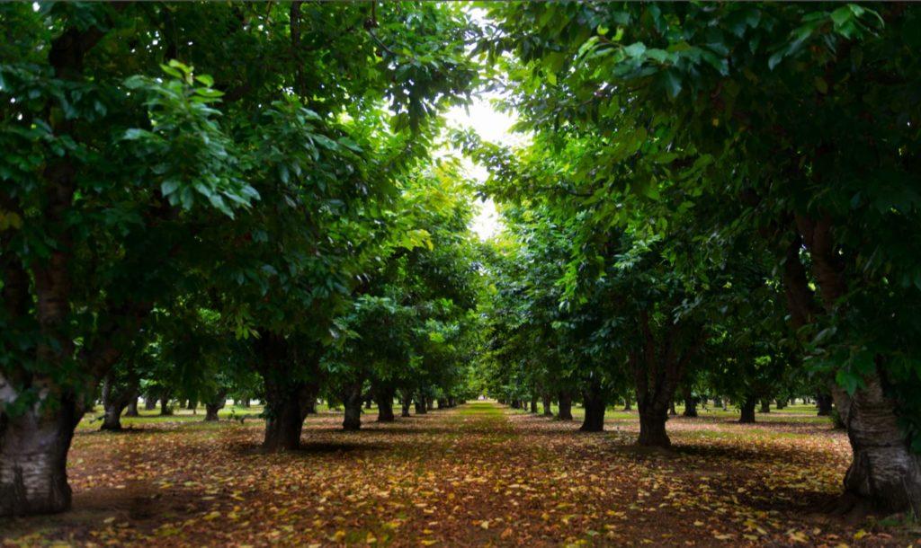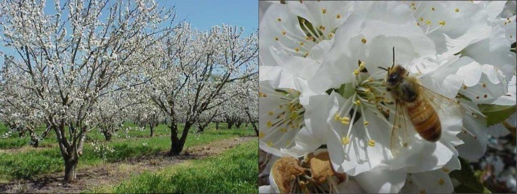 3月頃の開花時期には白い桜の花が咲きます。日本のソメイヨシノなどと比べるとやや遅い時期の開花です。ミツバチを使って授粉を行うとても重要な時期です。