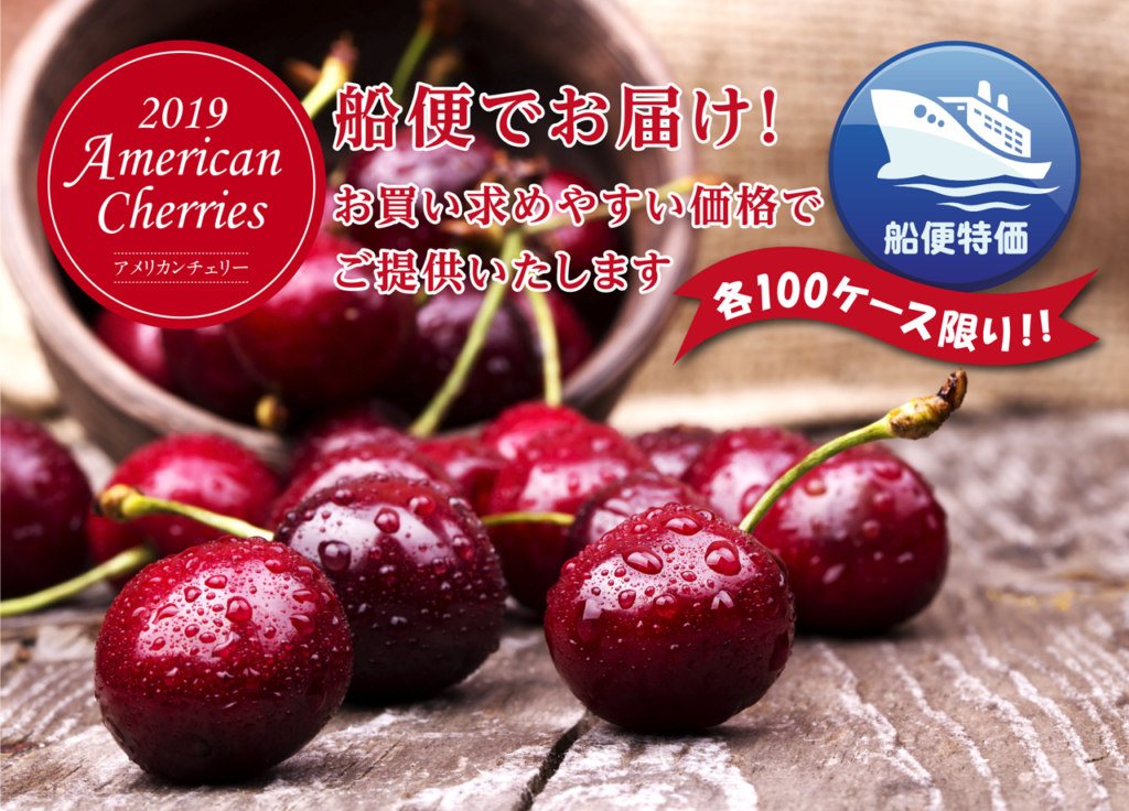 写真は2019年に当社が販売した船便チェリーです。実が硬い分国産のサクランボよりは長持ちするので、品質の良い物は冷蔵船で輸入することも可能です。こうしたチェリーは低価格で販売できます。