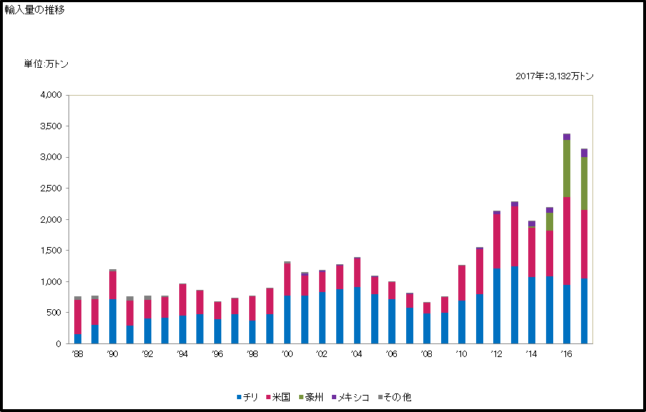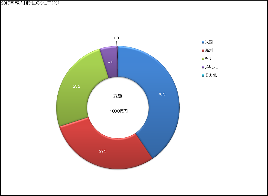輸入先は北から南へアメリカ、メキシコ、チリとアメリカ大陸を縦に走る3ヵ国が大半を占めています。これは前述したようにチチュウカイミバエの影響で他産地からの輸入が禁止されているためです。2014年に解禁されたオーストラリア産が早くも4分の1のシェアを持っている点も注目です。これらの産地は緯度の違いから生産時期が異なるため、弊社は産地リレーを行うことによって通年供給を可能にしています。