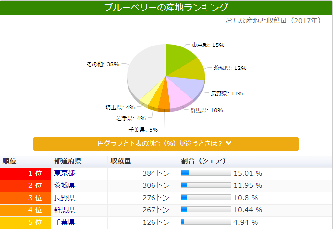 ブルーベリーは、東京都が日本一の生産量を持っています。実が柔らかく日持ちも短いことや、ブルーベリー狩りなどを楽しむ目的もあり、東京および近郊に生産が集中しています。