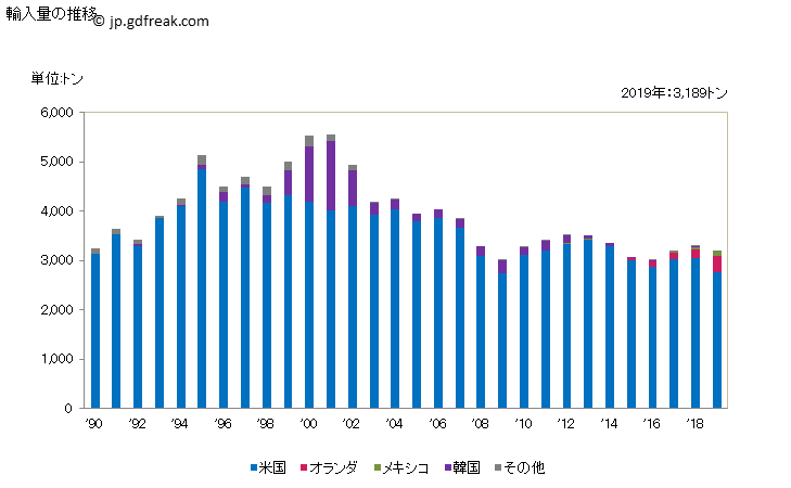 輸入のイチゴはあまり見かけないかもしれませんが、実は通年でかなりの量が輸入されています。イチゴの輸入量はここ10年、3000トン前後で推移しており、大きな変化はありません。