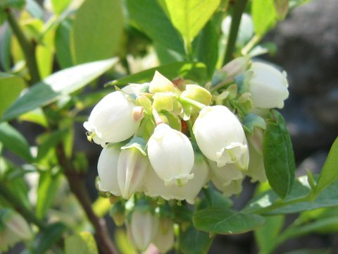 冬の終わりから春にかけてブルーベリーの花が咲きます。花が変形して実になるので、この時点でどことなく実を思わせる形です。ハイブッシュ系は自家受粉しますが、他家受粉のほうが実の付きがよくなるのでミツバチをつかって受粉させます。